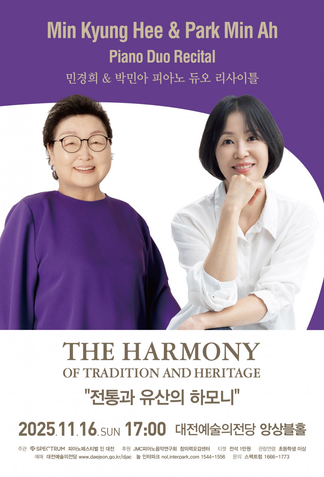 오는 11월 16일(일) 오후 5시, 대전예술의전당 앙상블홀에서 피아니스트 민경희 데뷔 50주년을 기념하여 민경희 & 박민아 피아노 듀오 리사이틀을 개최합니다. 이번 무대는 "전통과 유산의 하모니"라는 부제로, 한 세대를 넘어 이어지는 음악의 유산을 기념하고 스승과 제자간의 깊은 관계를 고전주의 음악의 대표 작곡가 모차르트의 위대한 피아노 앙상블 작품을 통하여 관객과 소통하고자 기획되었습니다. 대전의 대표 원로 피아니스트 70대와 50대 피아니스트 제자와 함께하는 앙상블 연주는 관객들에게 깊은 음악적 유산과 전통을 선물할 것입니다.